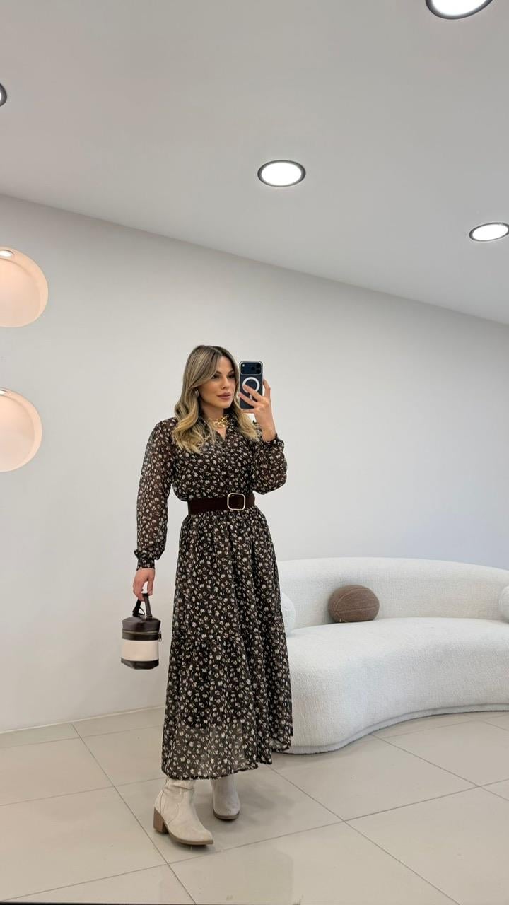 Desenli Şifon Kemerli Elbise (SPKmr)