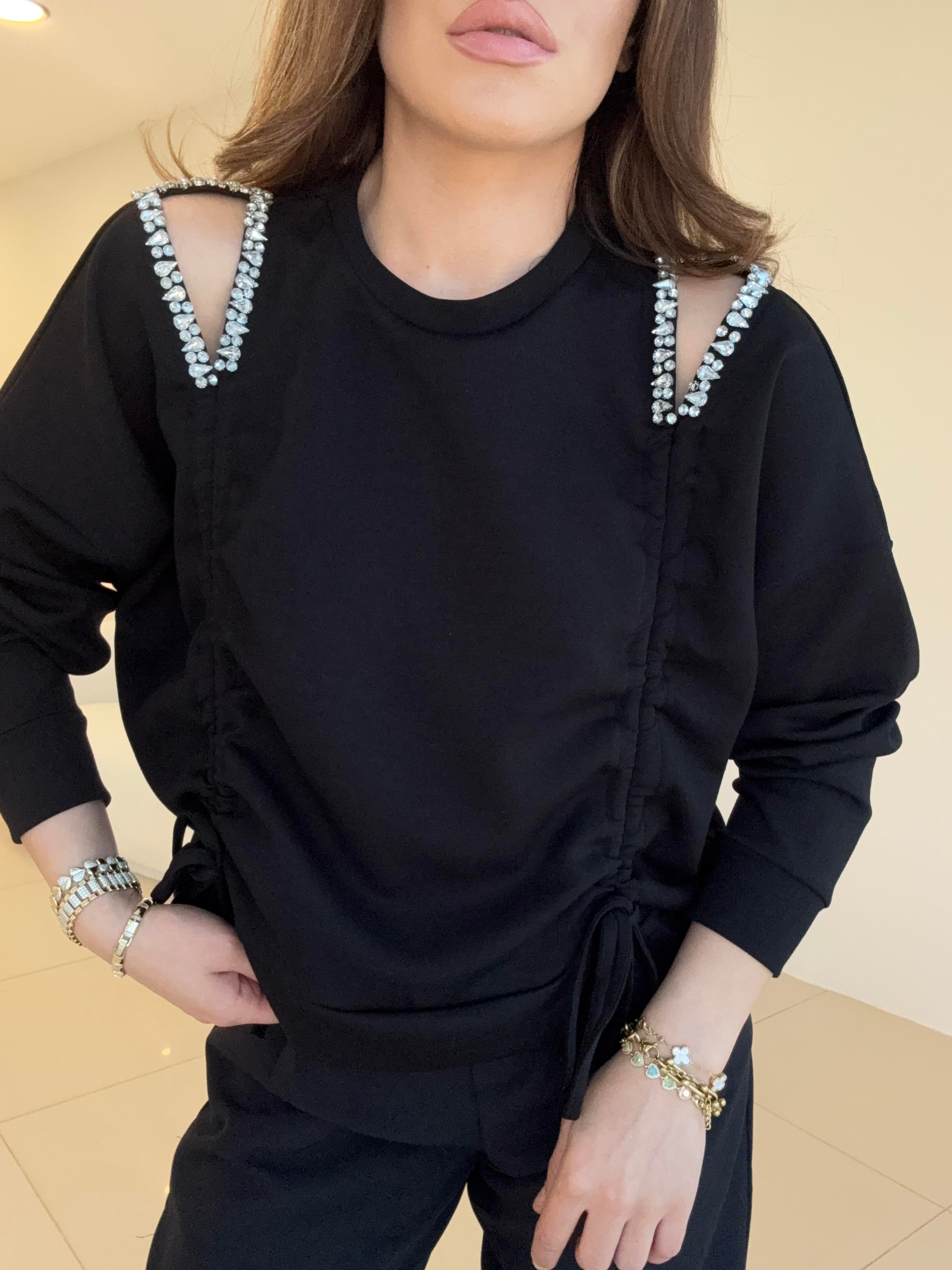 OMUZ DEKOLTELİ VE TAŞ DETAYLI SWEAT KIRMIZI