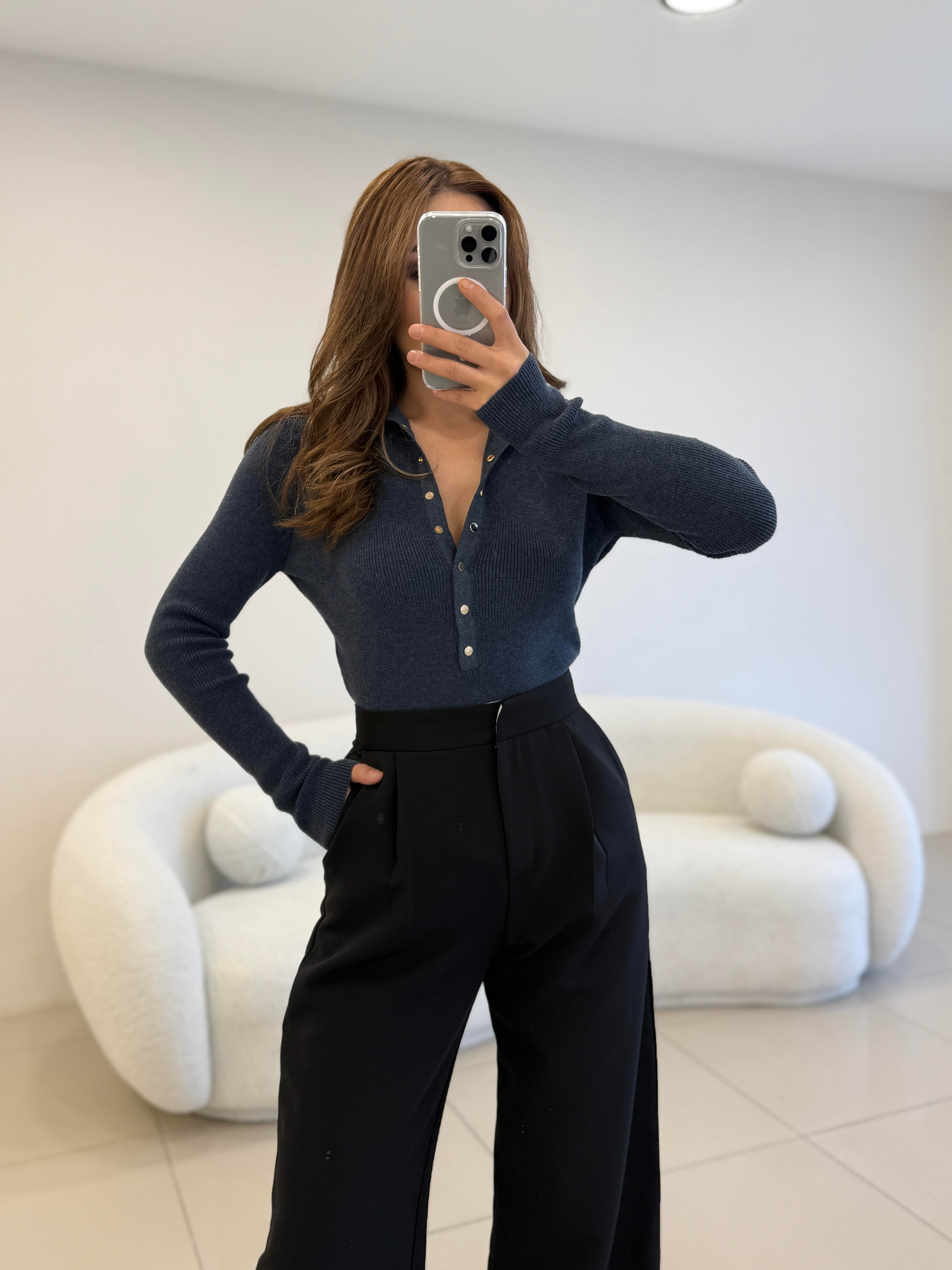 ÖNÜ ÇITLI DİK YAKA KAZAK MAVİ