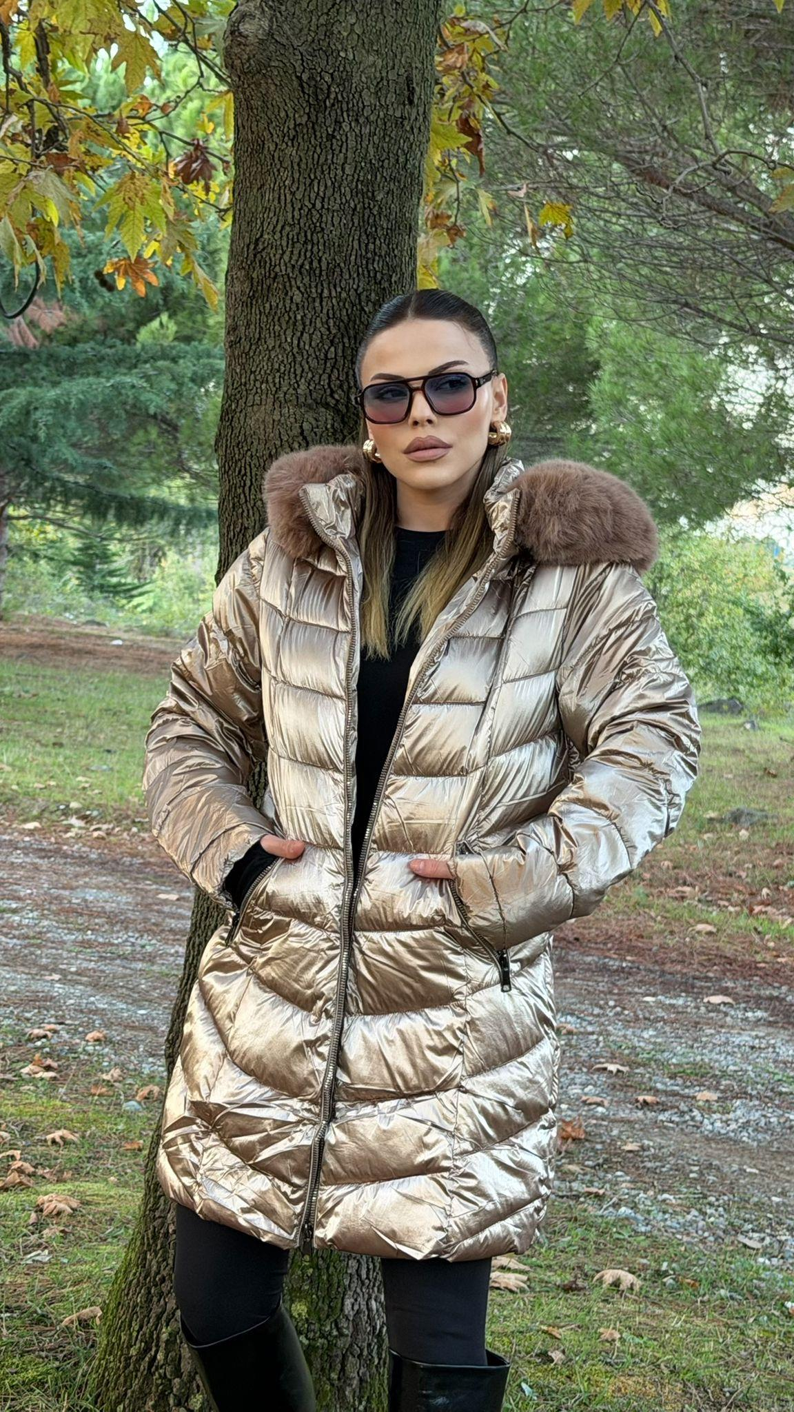 ÖZEL SERİ KÜRK KAPŞONLU PARLAK ŞİŞME MONT GOLD