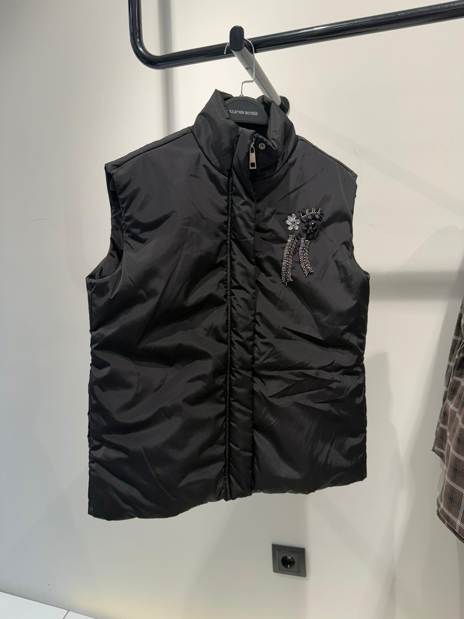 PREMİUM SERİ TAŞ İŞLEMELİ VE KEMER DETAYLI YELEK SİYAH