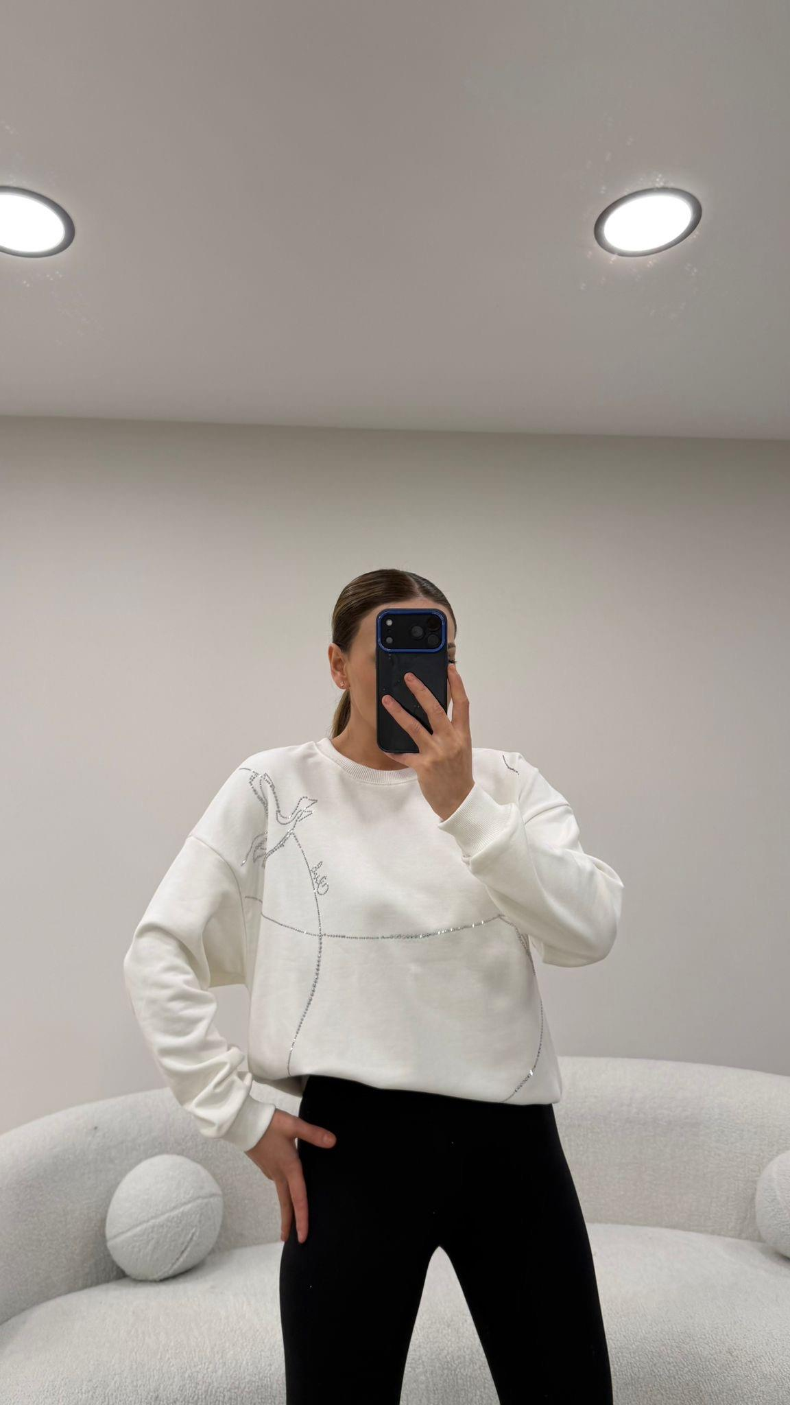 TAŞ VE KUŞ İŞLEMELİ SWEAT BEYAZ