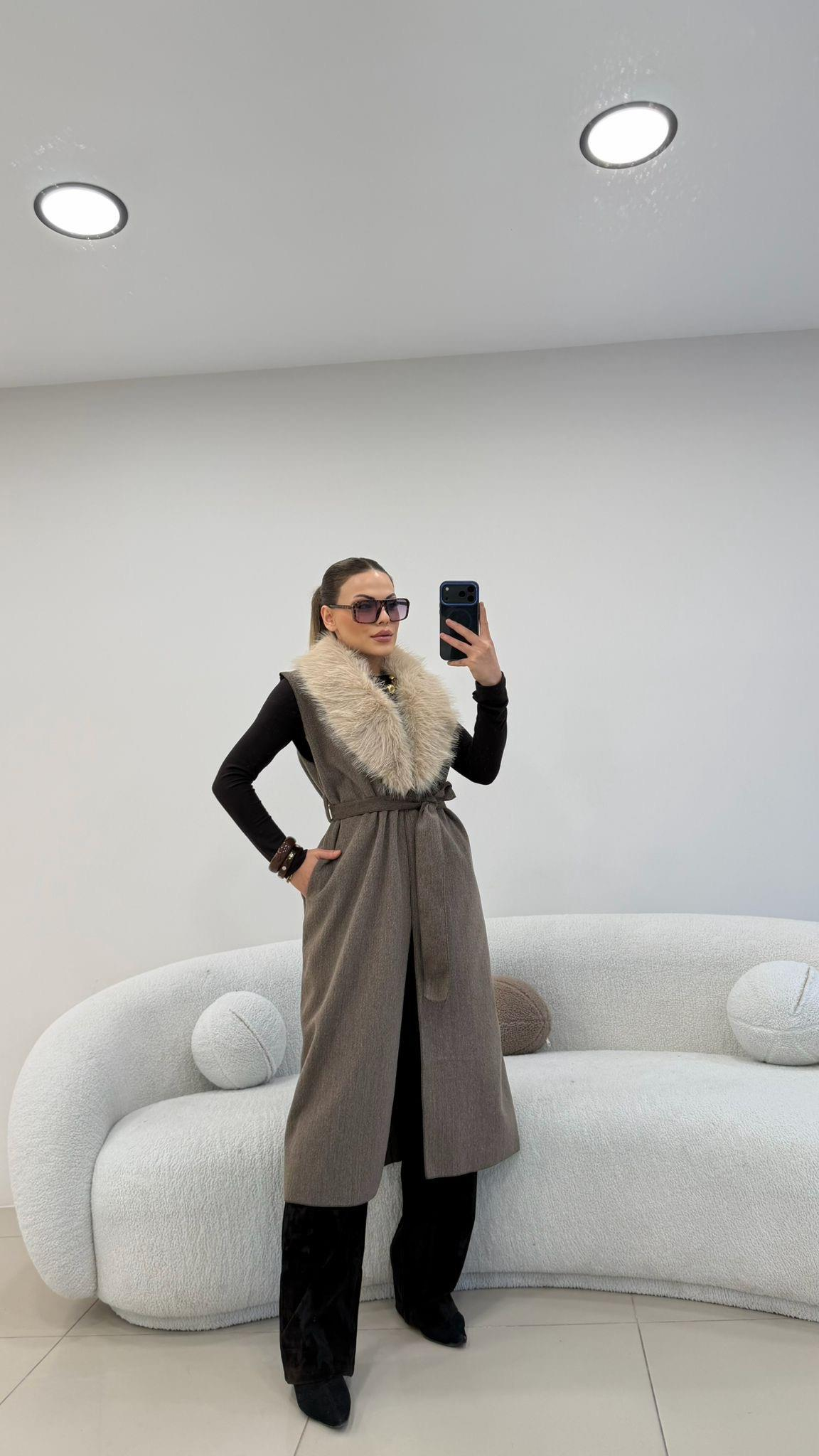 YAKA KÜRKLÜ UZUN KAŞE YELEK KAHVE