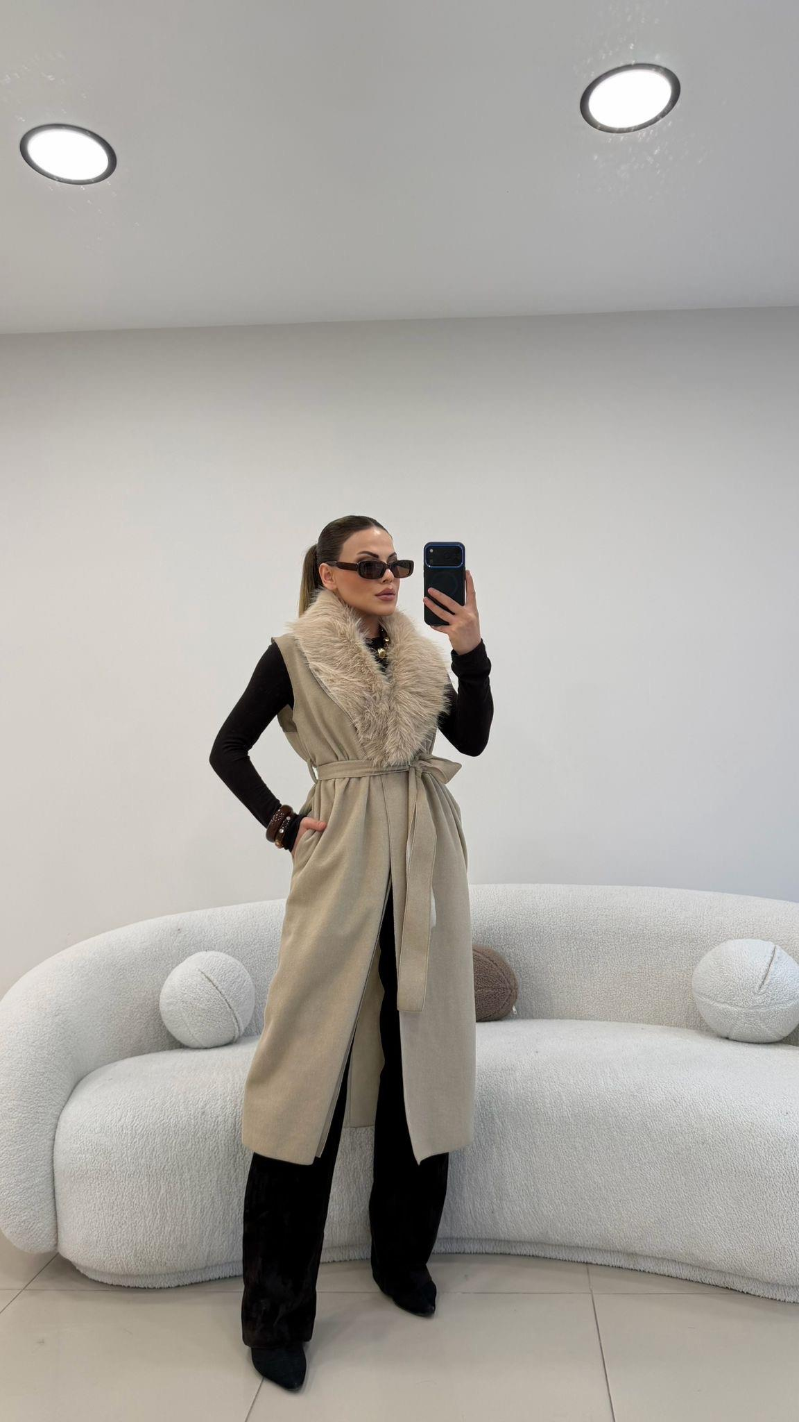 YAKA KÜRKLÜ UZUN KAŞE YELEK TAŞ