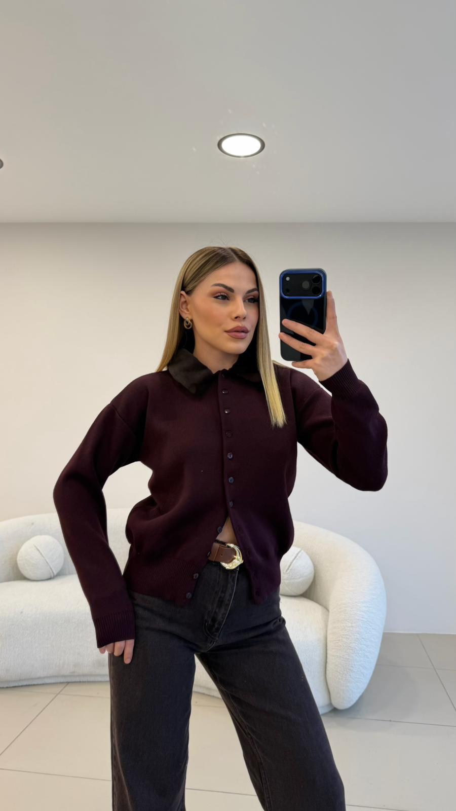 YAKASI KÜRK DETAYLI TRİKO HIRKA BORDO