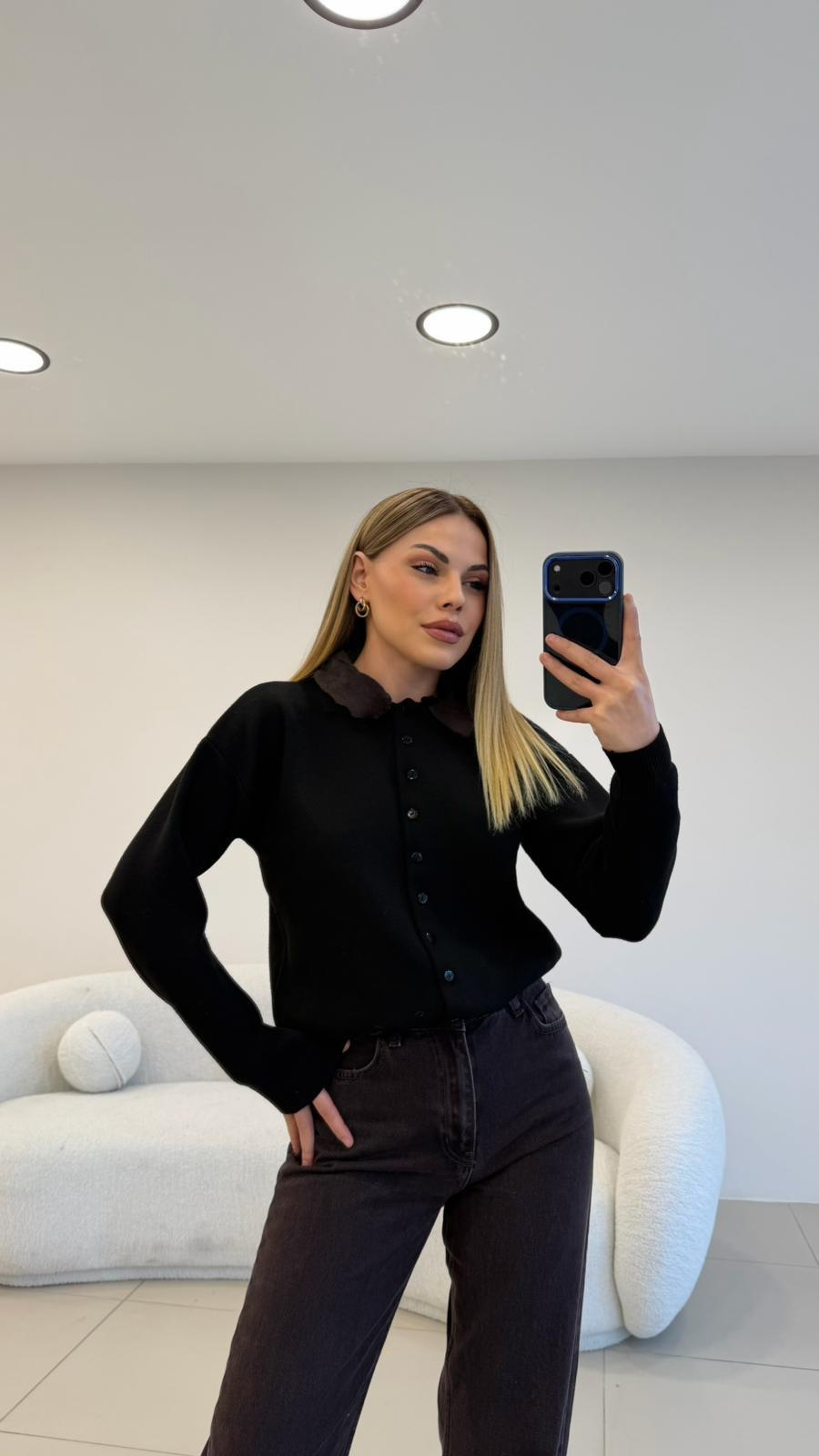 YAKASI KÜRK DETAYLI TRİKO HIRKA SİYAH